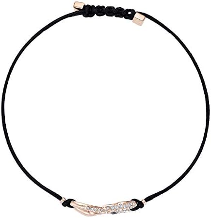 【素材と品質へのこだわり】着脱がとても簡単なブラックのコードブレスレット。ローズゴールドカラーコーティングを施したS字フックのシンボルが特徴で、きらめくクリスタルのパヴェをエレガントにあしらいました。
