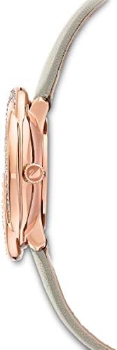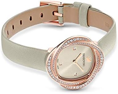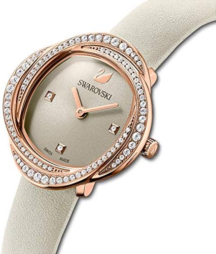 【Attention to Materials and Quality】Swiss quartz analog watch with rose gold-tone coated stainless steel case and leather strap with a grey dial with crystal pave. Dial features crystal index markers and Swarovski logo at 12 o’clock