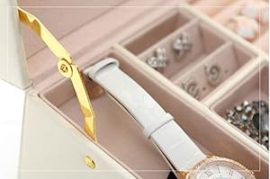 一段目:区切り4個、腕時計、ピアス、リング、イヤリングなどをそれぞれ整理して管理できる。 二段目:大きい区切り2個、ブレスレット、ブローチなど少し大きめの物を収納する。 三段目:区切り6個、ネックレス、ブレスレット、などの小物全部収納できる。