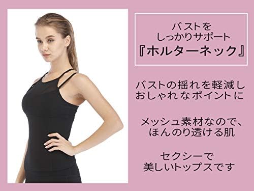 【上品なホルターネック】ほんのり肌が透けるメッシュでのホルターネック。おしゃれなポイントになりつつ、バスト部分をしっかりカバーします。屈んだり、大きな動きも安心!細めのストラップでバックにかけてクロスしている部分もおしゃれなヨガウェアです。