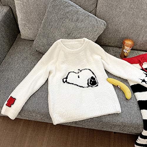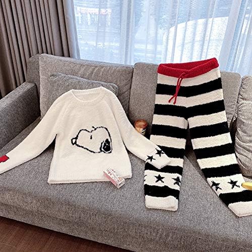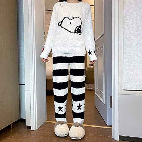 Women’s Pajamas, Loungewear, Top and Bottom Set, Fluffy, Long Sleeve, Loungewear, Cold Protection, Fleece-Lined, Warm, Cute, Soft, Skin-friendly, Snoopy Print, Sleepwear, Autumn and Winter