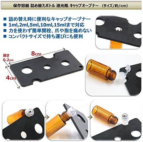 小分け瓶の中栓は付属の専用オープナーを利用して綺麗に外れるので詰め替えも簡単。きっちり密閉できるボトルキャップで液漏れや液だれを防ぎ、遮光効果の高い“茶色“ボトルで紫外線からの品質劣化を抑えます。